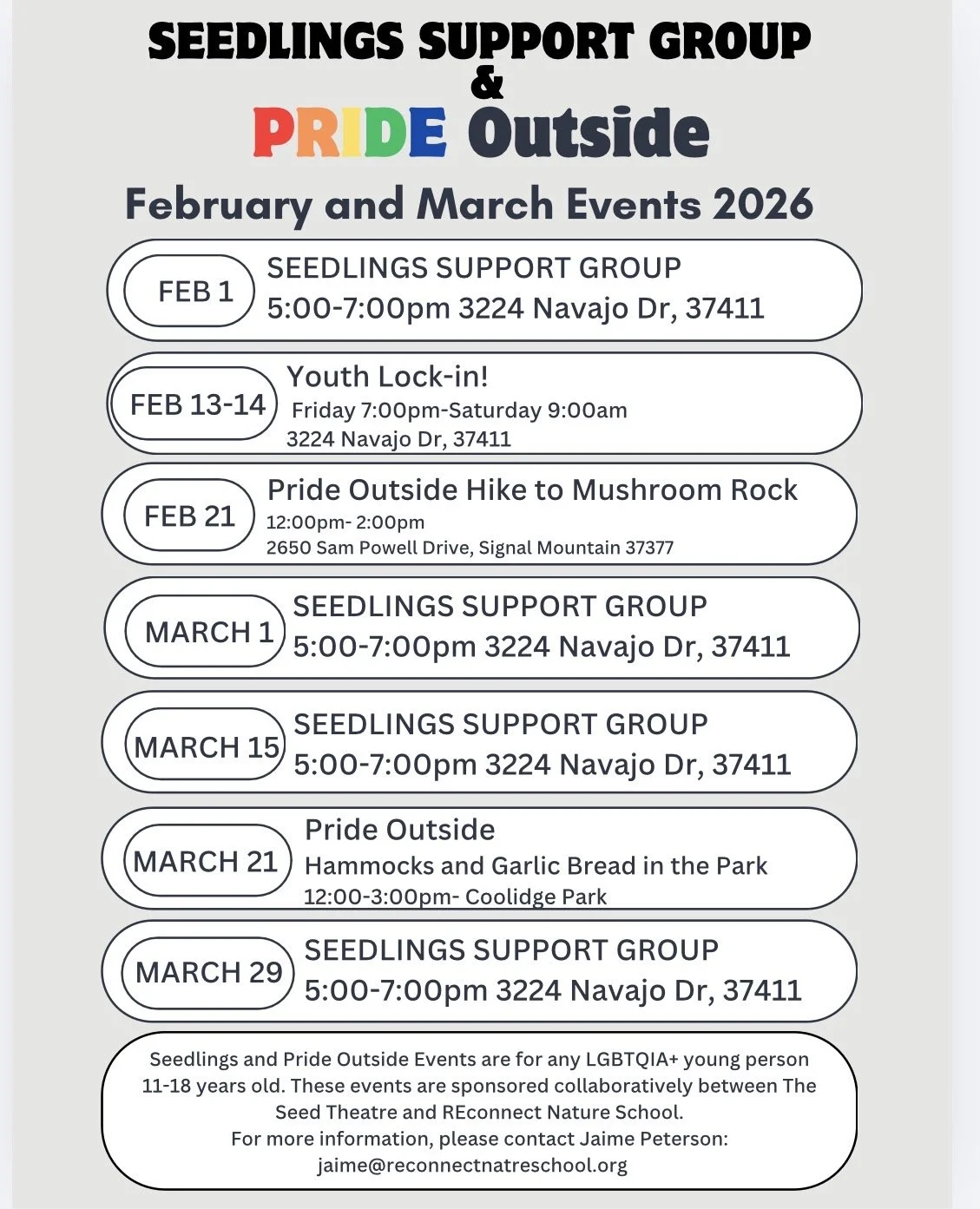 We are excited to continue PRIDE Outside: Queer Youth Adventures as a year round series! We also sponsor and host the Seedlings Group, which is a support group for LGBTQIA+, nuerodivergent, and culturally queer young people. Below is our schedule for February and March!